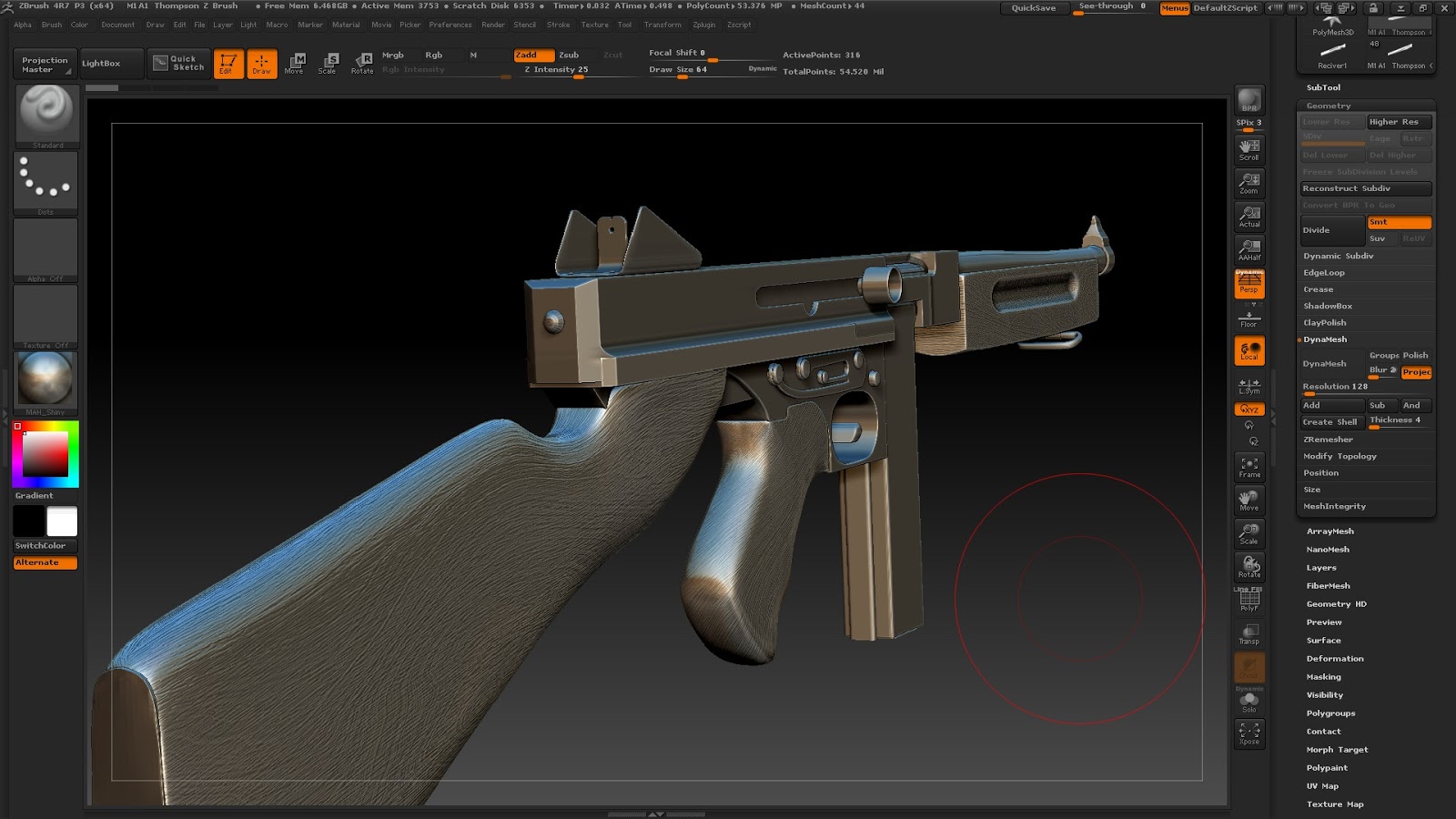In Z Brush I smoothed out any hard edges by dividing the mesh up again and again. I then added the wood grain to the stock using alphas and noise.