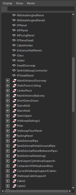 I arranged each object in the outliner and regularly cleaned the object history. Because I had so many panel variations I had to find a way of organizing them that made sense, so I used M, F and N to represent male, female and neutral. Similar to the system that's used to label cables, this allows me to look at a panel from the front and by looking from left to right understand which panel it is. For example, MFLongPanel; when I look at this panel from the front I know that the left hand side is male and the right hand side is female. I also know that the panel is long and not short. Organizing my outliner like this helped me to keep a handle on things, sometimes when your working with a busy Maya scene it can become difficult to keep track of your objects. Setting up my scene in this way ensures this doesn't happen.
